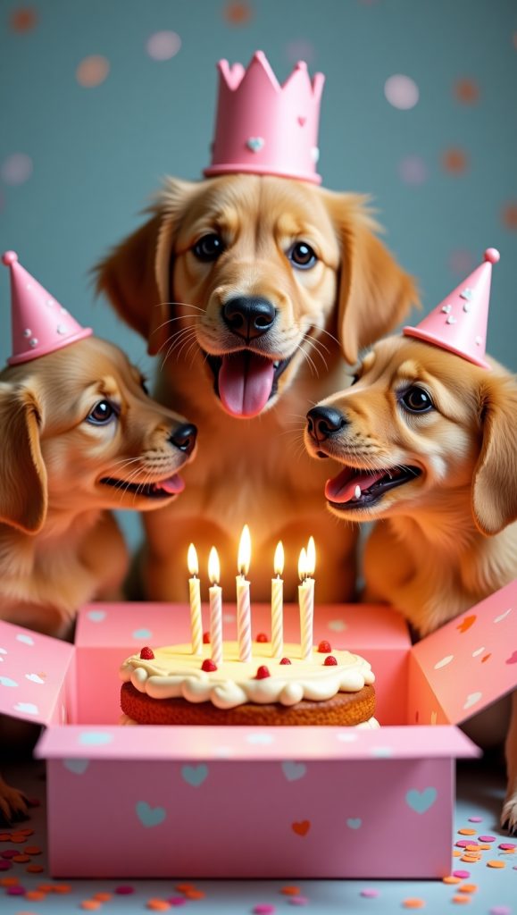 IdeogramGolden retriever puppies celebrating with birthday cake